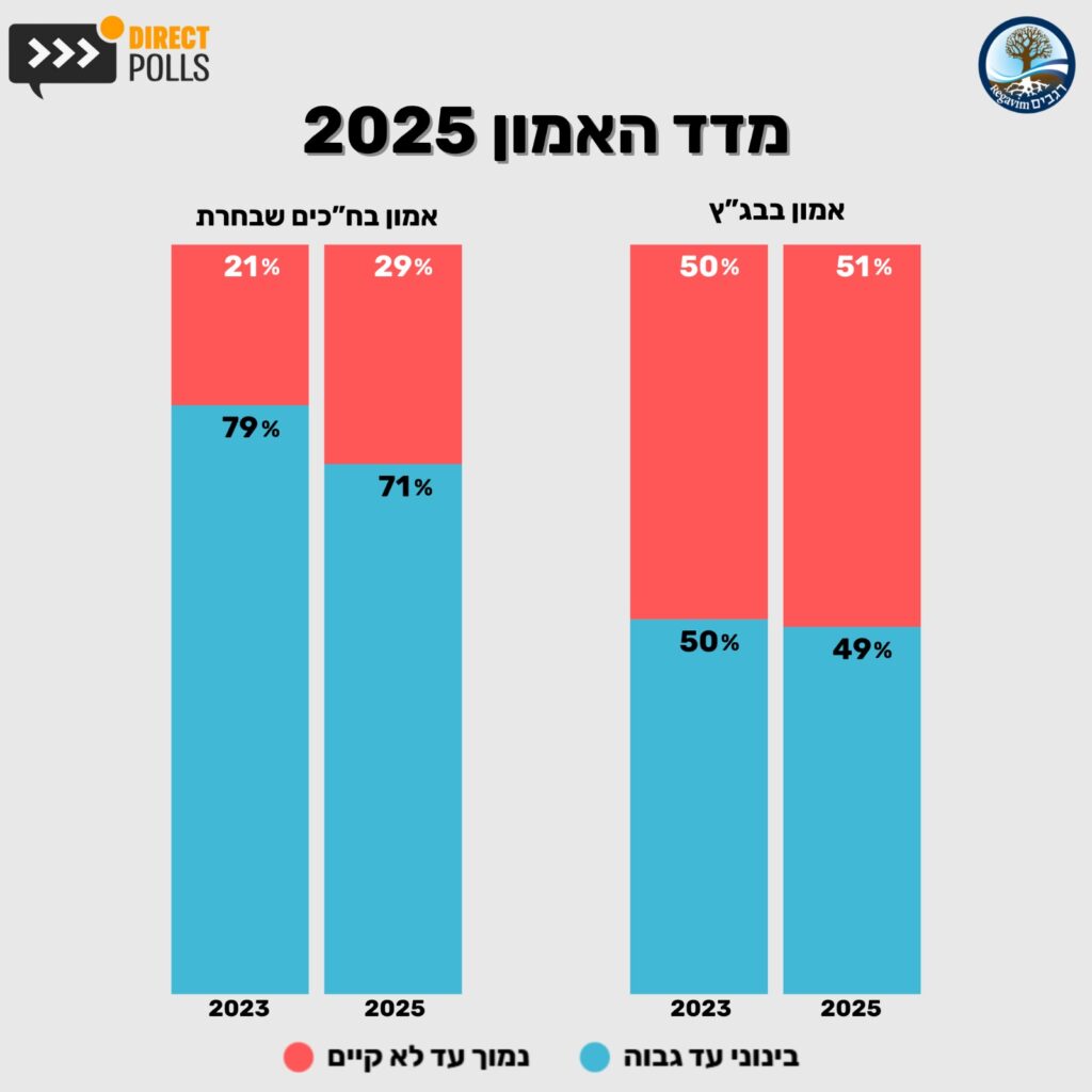 סקר "מדד האמון" שערך מכון דיירקט פולס עבור תנועת רגבים מצביע על שחיקת האמון במוסדות המדינה, צניחה דרמטית באמון בצה"ל וקונצנזוס ציבורי נגד הקמת מדינה פלסטינית. רגבים: "קץ התמימות"