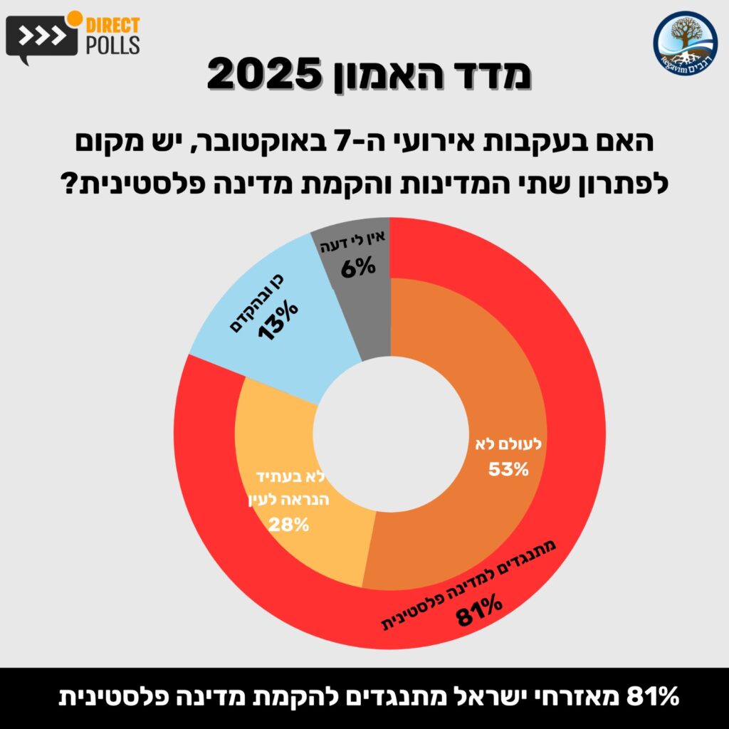 בהמשך להצהרה ההיסטורית על התנגדות להקמת מדינה פלסטינית שעברה בקונצזוס רחב בכנסת בסוף שנת 2024, בדק הסקר את עמדות הציבור ביחס לסוגיה זו ומצא כי 81% מכלל הציבור מתנגדים להקמת מדינה פלסטינית. מתוכם, 53% מתנגדים בנחרצות להקמת מדינה פלסטינית אי פעם ועוד 28% מתנגדים אף הם, אך בהסתייגות; "לא בעתיד הנראה לעין", לעומת 13% משיבים, ממפלגות השמאל הרדיקלי, שהשיבו "כן ובהקדם". תוצאות אלו תואמות את תוצאות השאלה על תפיסת הציבור הישראלי את הרשות הפלסטינית: 70% השיבו כי שאיפותיה ביחס לישראל דומות עד דומות מאוד לשאיפות חמאס, לעומת 23% שהשיבו "שונות במידה מסוימת" ו-7% בלבד שהשיבו "שונות מאוד".