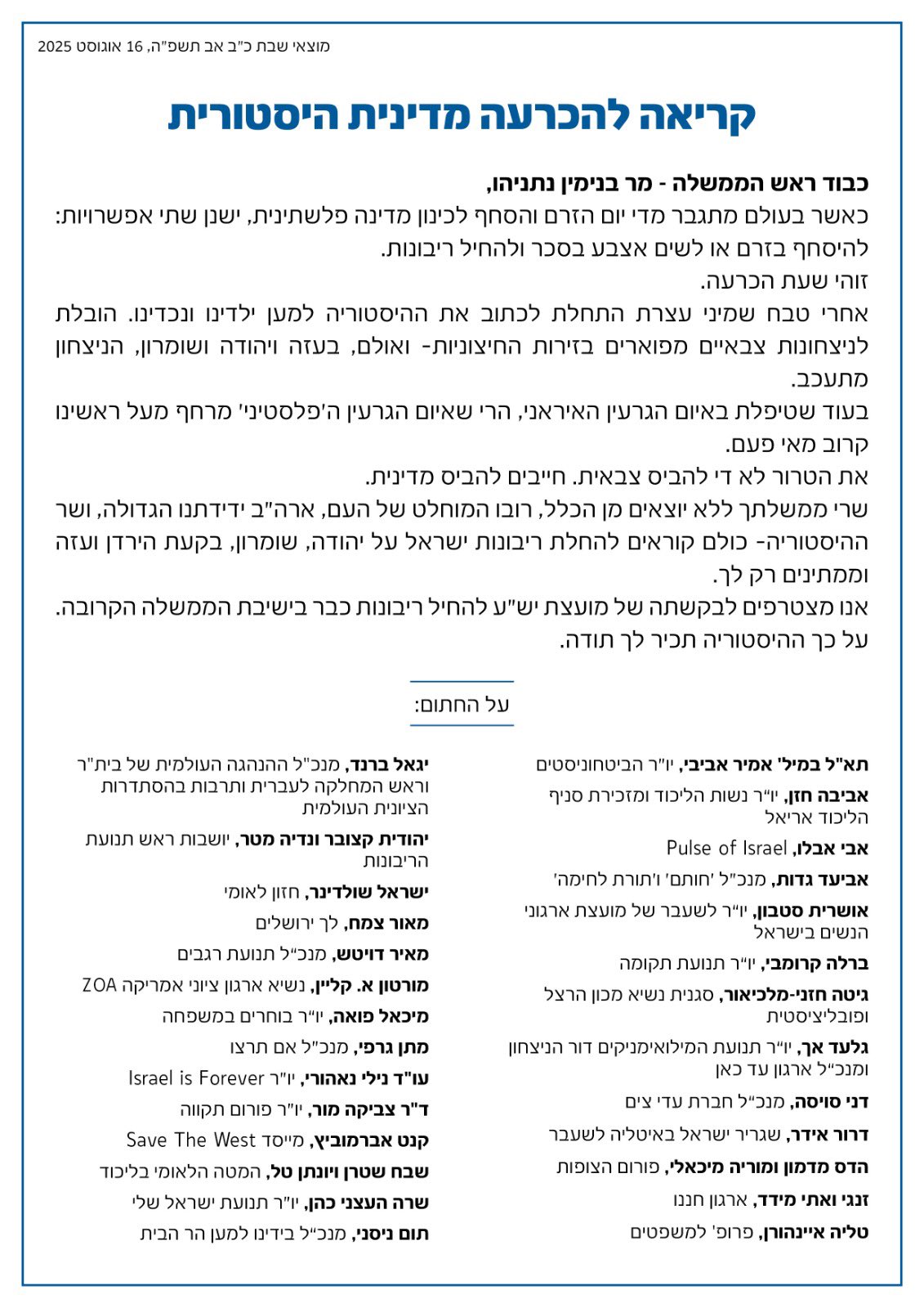 הצטרפנו לשורה של ארגונים שקראו במכתב לראש הממשלה לקבל החלטה ציונית ואמיצה על החלת הריבונות הישראלית ביהודה ושומרון. במכתב שיזמנו חברותינו יהודית קצובר ונדיה מטר, ראשי תנועת הריבונות, ומועצת יש"ע נכתב: "זוהי שעת הכרעה. איום הגרעין 'הפלשתיני' מרחף מעל ראשינו קרוב מאי פעם. את הטרור לא די להביס צבאית, חייבים להביס מדינית. כאשר בעולם מתגבר מדי יום הזרם והסחף לכינון מדינה פלשתינית, ישנן שתי אפשרויות: להיסחף בזרם או לשים אצבע בסכר ולהחיל ריבונות. מבקשים לא להשאיר ואקום שעלול להתמלא עם החלטה באו"ם להקמת מדינה פלשתינית. זה הזמן להחיל ריבונות"