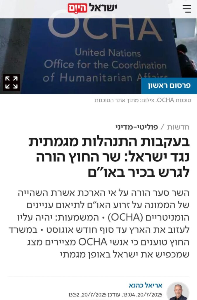עוד הרבה לפני תעשיית ההכפשות לצה"ל ומדינת ישראל במלחמת "חרבות ברזל", סוכנות האו"ם לענייני "הפליטים הפלסטינים" OCHA, פעלה בגלוי במשך שנים לחולל את עלילת הדם הגדולה ביותר בעת המודרנית, ושמה "אלימות המתנחלים". עם אלפי דיווחי שווא, סילופים ועיוותים, יצרה מצג שווא של תופעת ענק המאיימת על המזרח התיכון. גירוש ראש הסוכנות מהארץ הוא צעד חשוב בהשבת הריבונות, אך את הנזק העצום למדינת ישראל יקח עוד זמן רב לתקן ונדרשים עוד צעדים רבים.